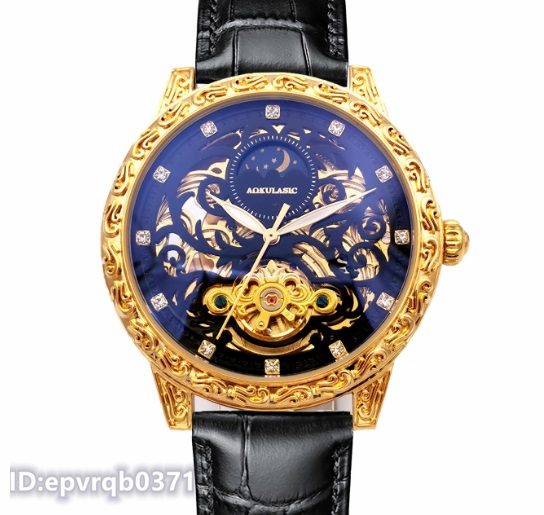 - 高級腕時計 機械式自動巻 新品 トゥールビヨン スケルトン ダイヤ花柄彫り メンズ ウォッチ 昼夜表示 夜光表示 本革ベルト 2色/ゴールド