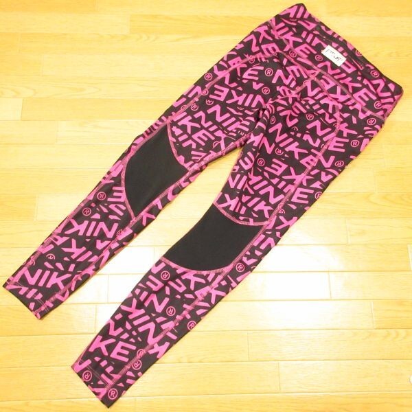 > ◎美品!NIKE ナイキ DX0119-665 スポーツタイツ ロング スパッツ レギンス ポケット付き 総柄 レディース ピンク×黒 Sサイズ◆PA3892