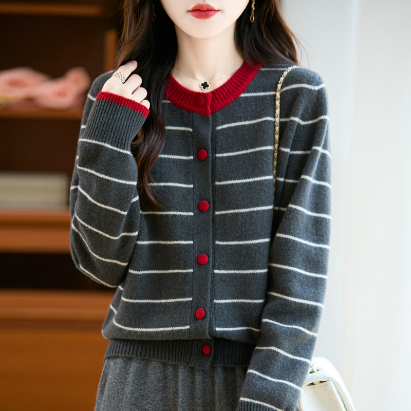 - 新品*オシャレ ニットカーディガン レディース オフィス ボーダー柄 トップス 上品 日常着 通勤 セーター 着痩せ ゆったり 防寒*グレー
