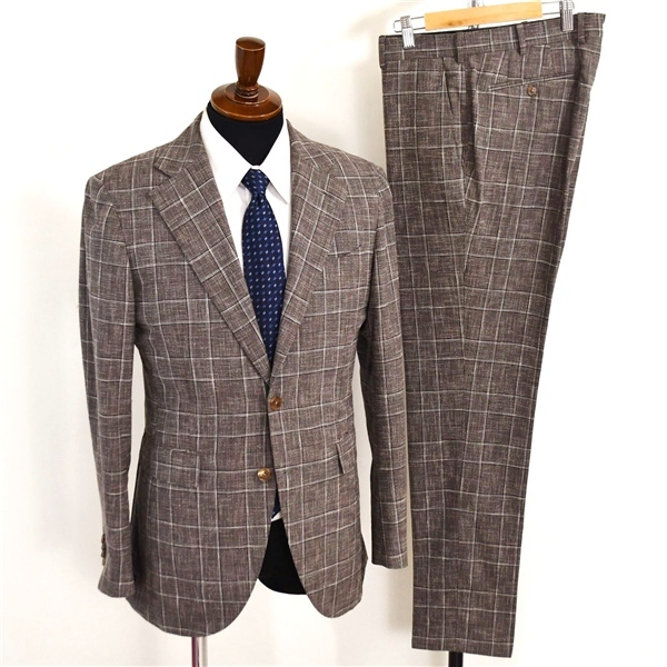 ・春夏対応。イタリア製カノニコ生地使用。2つボタンシングル。袖口4つ釦本切羽。背抜き。サイドベンツ。フラップポケット。ネーム刺繍あり。