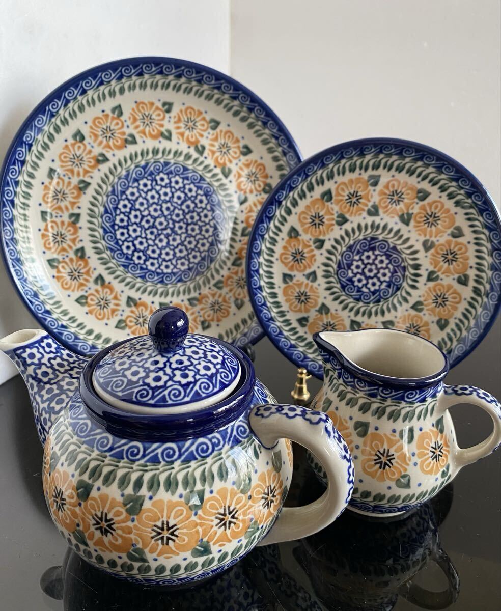 > 新品同様◆ポーリッシュポタリー マリーゴルドモーニング ティーポット クリーマー プレート20cm プレート16cm ポーランド食器 4点セット