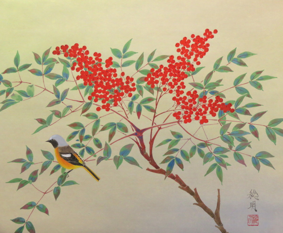 - JY1469◆◇掛軸 島田捻明 南天 尺八横 現代作家新作掛軸◇◆正月 年中掛け 普段掛け 魔除け 縁起物 日本画