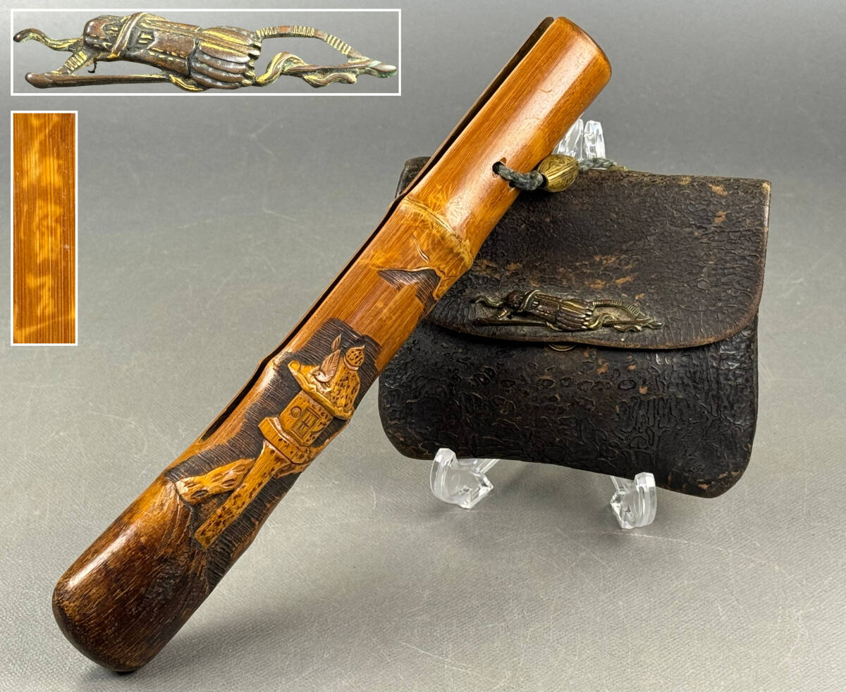 > 【偲】パイプ入 ホルダー 金塗留め具 竹製 細密彫刻 弓と蛇 煙草入れ 根付 提物 緒締 喫煙具収納 喫煙グッズ 長約20.5㌢ t-95