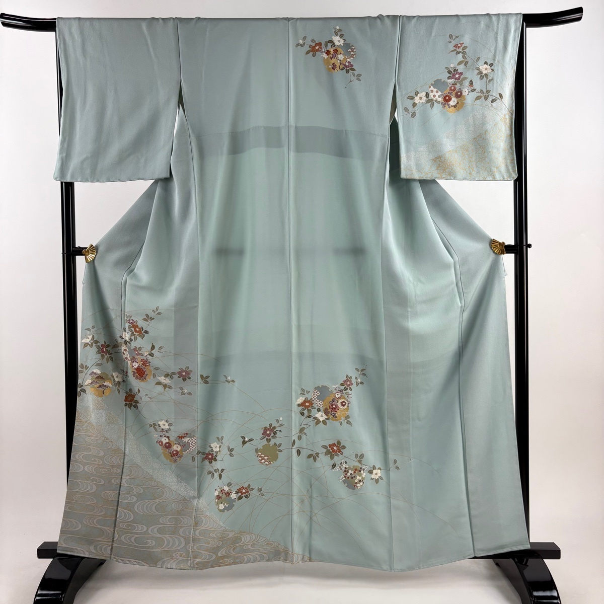 - 訪問着 身丈162.5cm 裄丈65.5cm M 袷 雪輪 草花 金彩 水色 正絹 秀品 【中古】