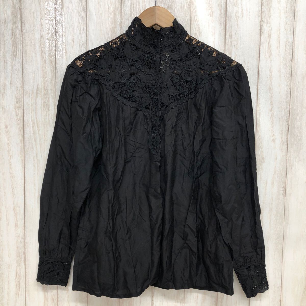 > 未使用 HANAE MORI ハナエモリ レースブラウス サイズ9 長袖シャツ ハイネック シルク コットン 黒 レディース YF531