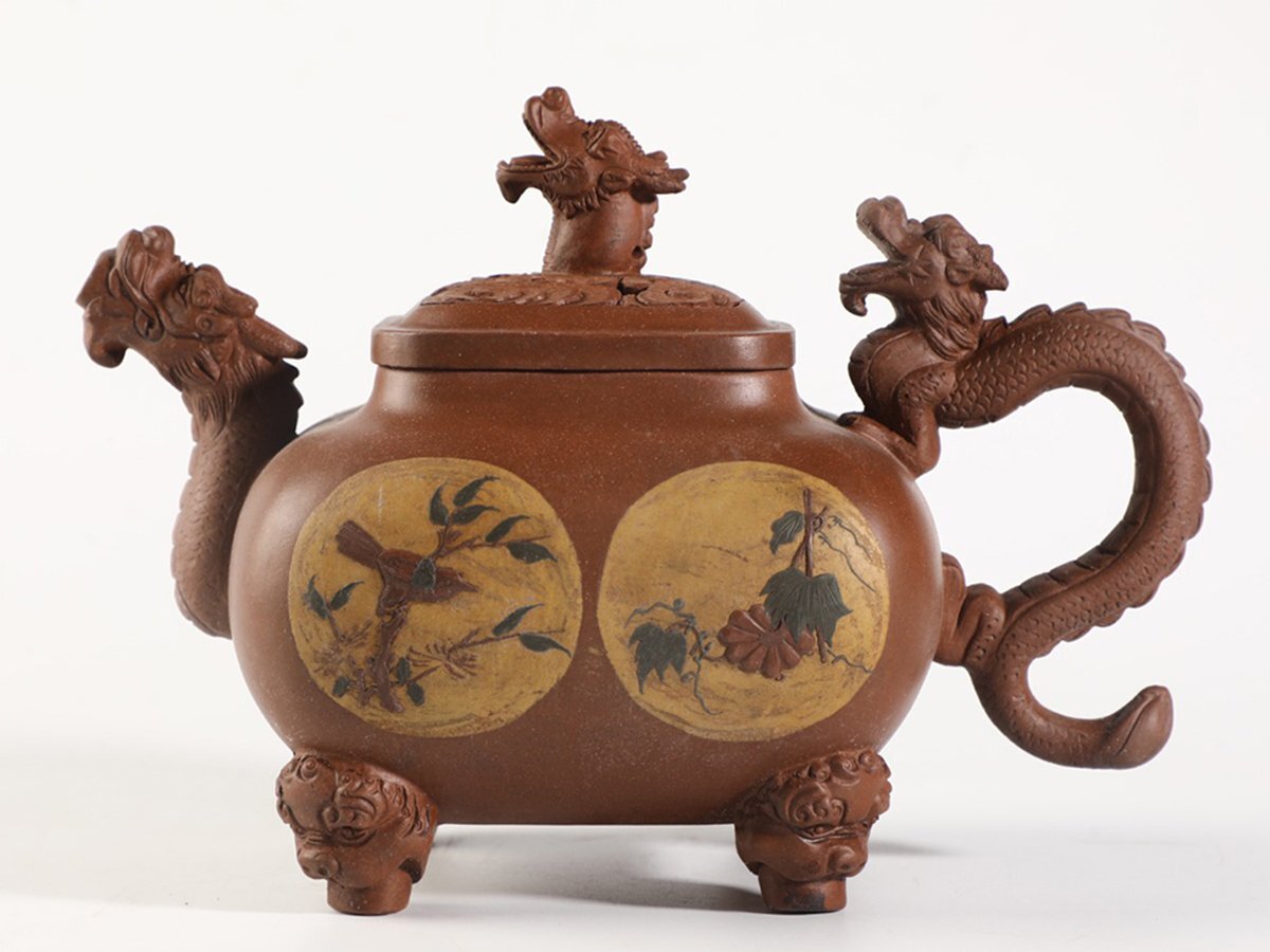 > 【安】清時代 咸豊御製 彩絵開光花鳥紋三龍茶壺 共箱 宜興紫砂 常滑 朱泥急須 煎茶道具 茶壷 古董品 時代物 290