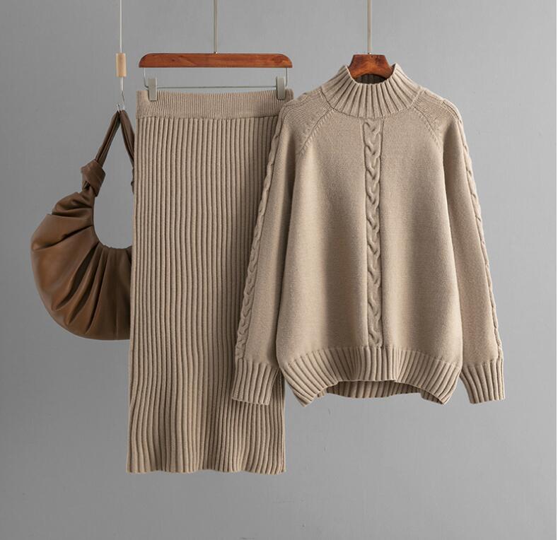 > 346 スカートスーツladiesレディース ◇ 秋冬 上質 ◇ 暖かい 厚手 ニット素材 ケーブル編み キャメル