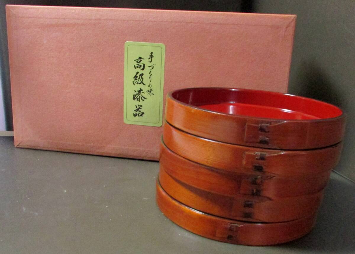 - 木製漆器 手作り曲げワッパ 銘々皿 内朱(5枚組)径:(約18cmxH1.8㎝)