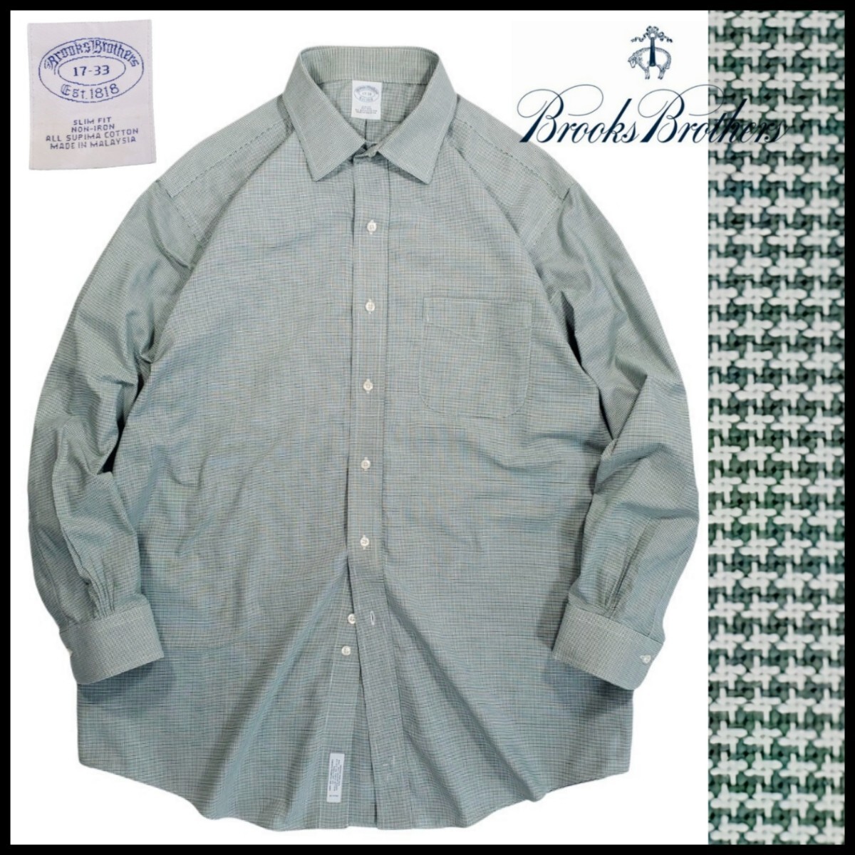 > w323/古着 BROOKS BROTHERS Est1818 長袖シャツ 17-33 ワイシャツ Yシャツ グリーン系 ブルックスブラザーズ 洗濯プレス済 ネコポス可
