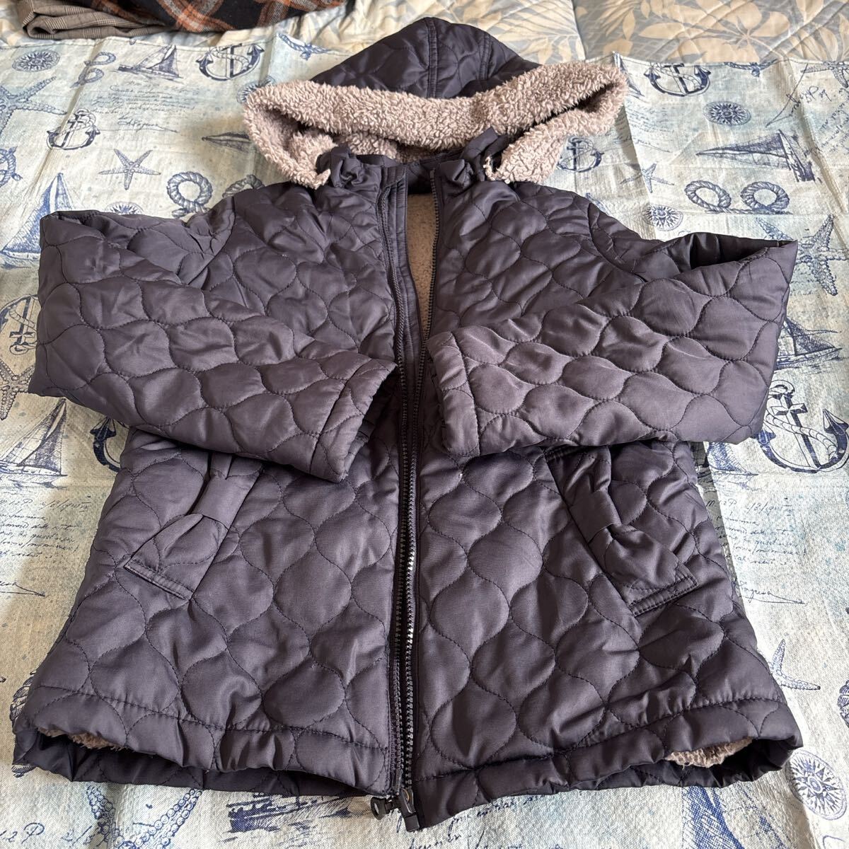 - GU女の子 紺色裏生地あたたかフード付きコート 140