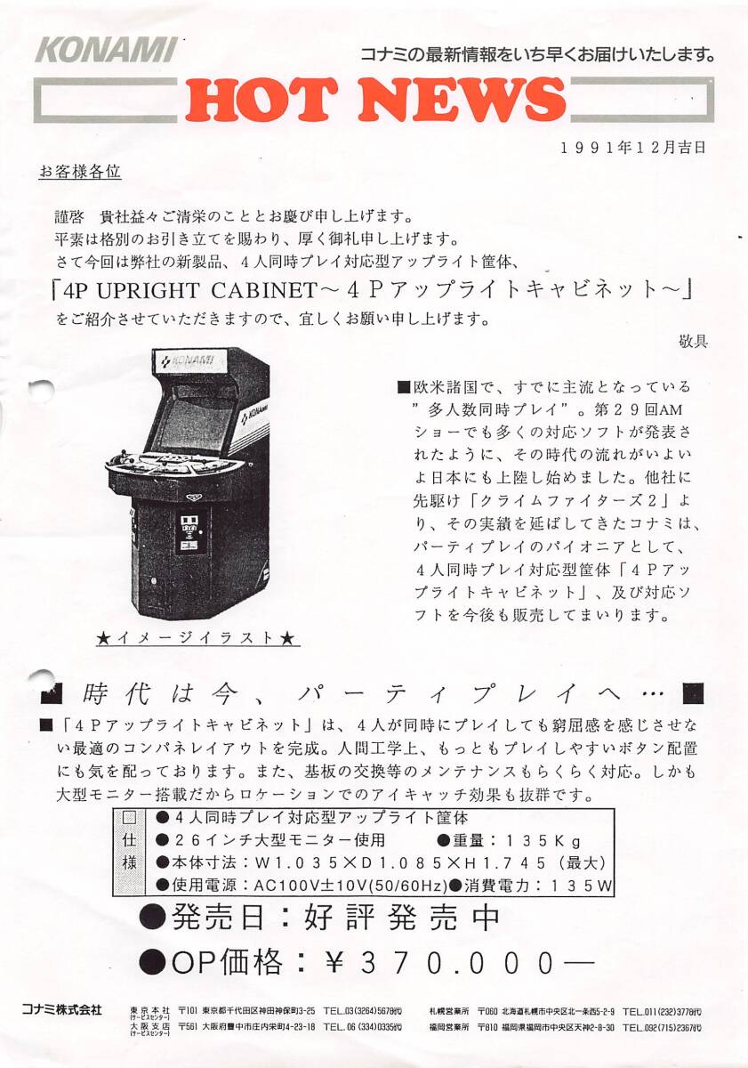 - 【コナミ】HOT NEWS 1991年 4Pアップライトキャビネット筐体 カタログ