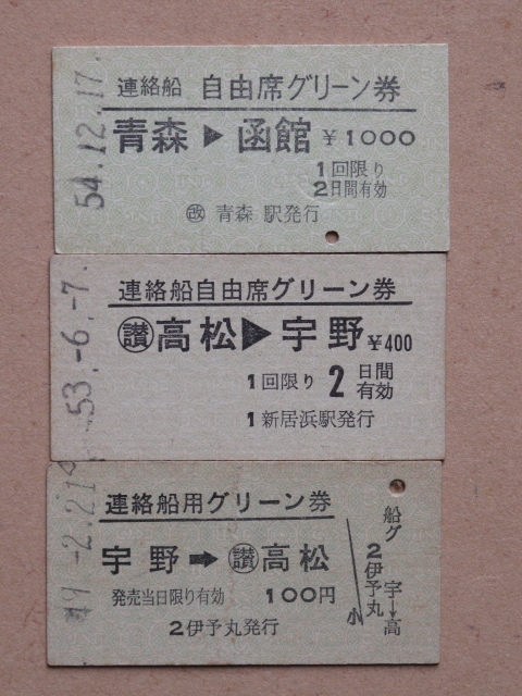 - 昭和49~54年 国鉄 連絡船 硬券 グリーン券 計3点 宇高航路 伊予丸 新居浜駅 青函航路 青森駅