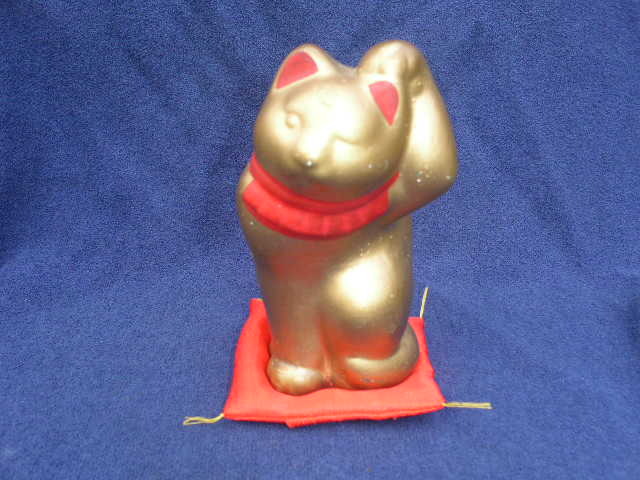 > ★レトロ★ 珍品 ハニベ焼 まねき猫 招き猫 金色 座布団付 はにべ 置物 商売繁盛 縁起物(ビンテージ・アンティーク・インテリア)