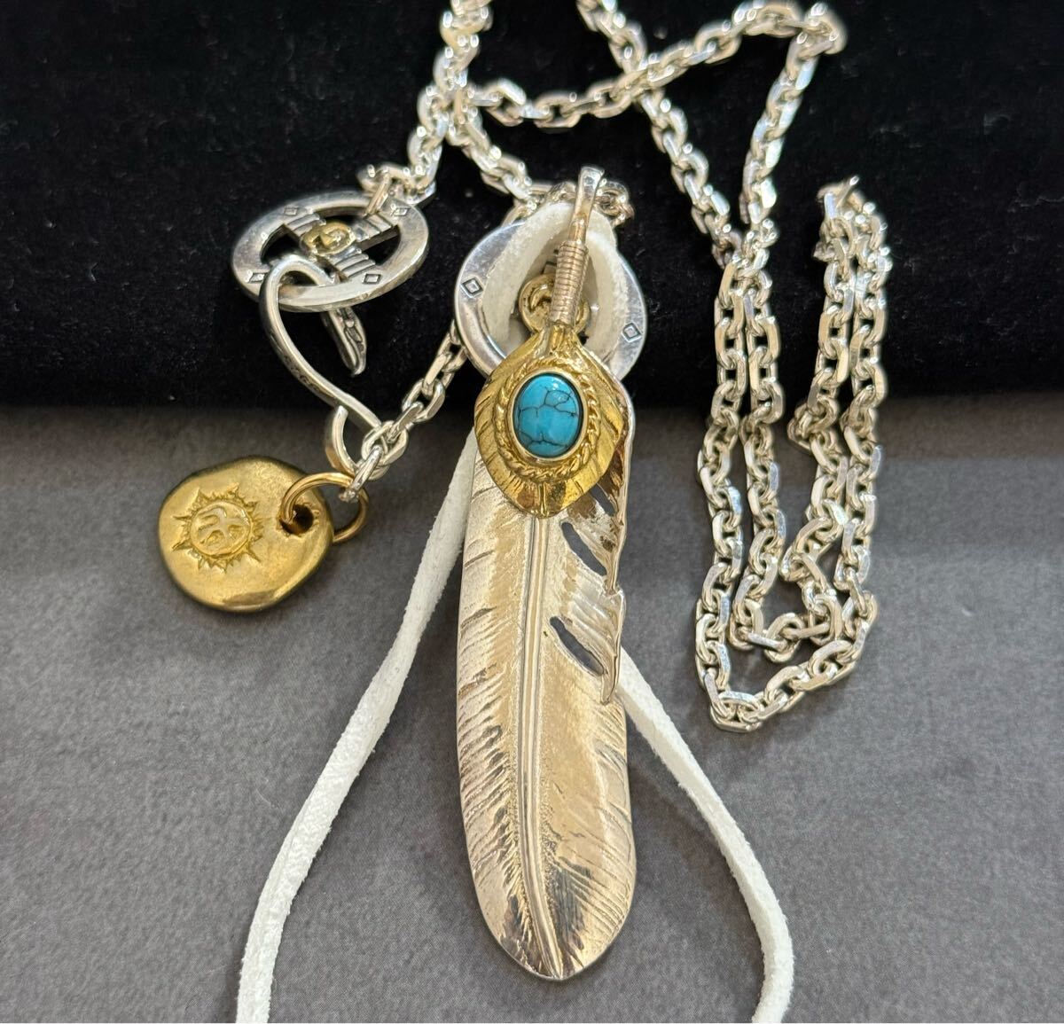 - シルバー925ターコイズフェザーネックレス 太角チェーン ゴールドイーグルメタル