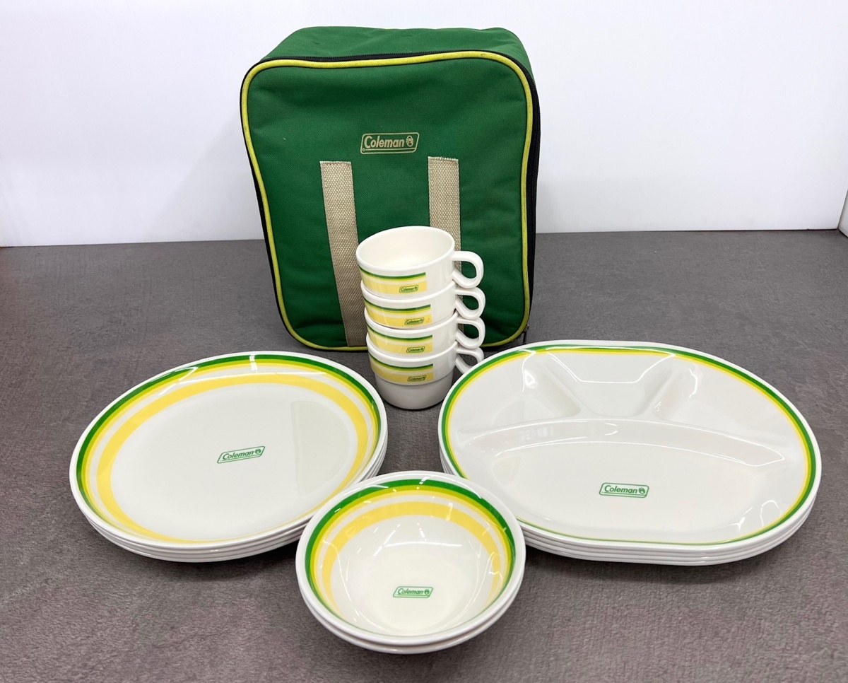 > レトロ! coleman コールマン ライムグリーン メラミン テーブルウェア セット 170-6469 ランチ プレート 食器 皿 コップ マグカップ