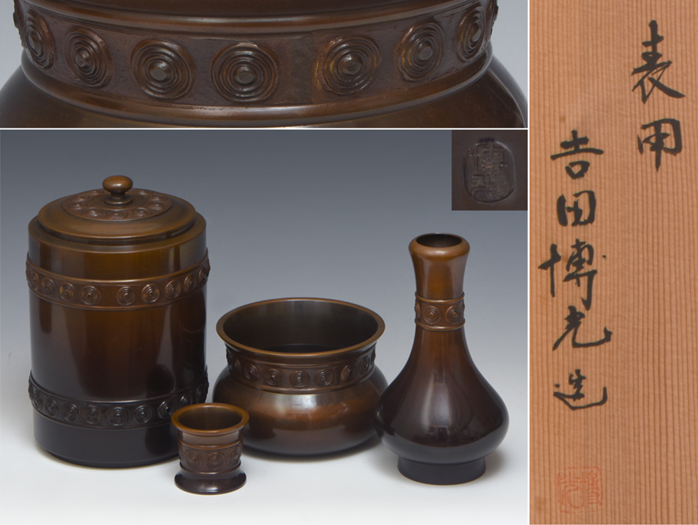 - 吉田博光(造)唐銅皆具 松竹梅文 皆具 共箱 水指/杓立/蓋置/建水 金属工芸 共箱 茶道具 u1050o