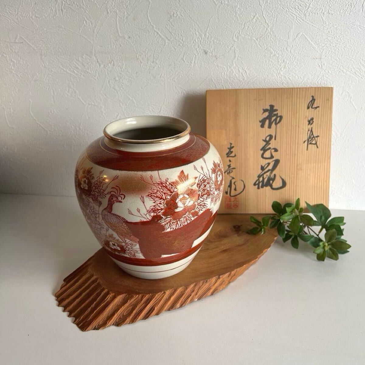- wasabi k909 九谷焼 御花瓶 花器・花入れ・飾り壺 豪華絢爛な赤絵金彩で描かれた存在感ある孔雀牡丹図 九谷光竜作 共箱あり 床の間飾り
