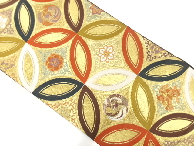 > 美品 七宝に鳳凰・花唐草模様織り出し 振袖用 袋帯 (IBE1K-005)