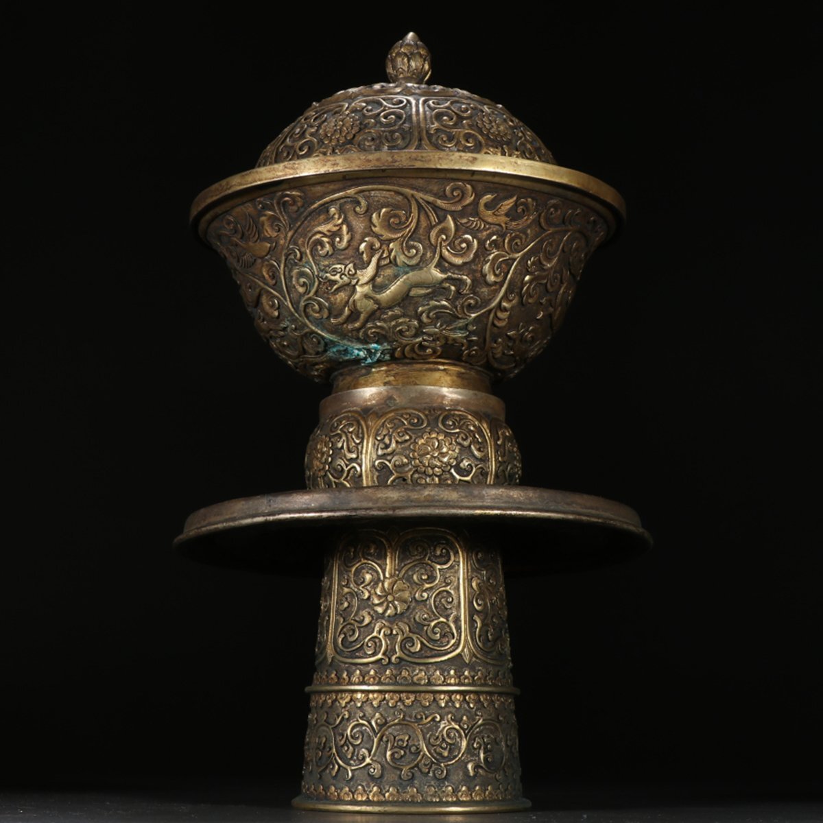 - 【安】清時代 銅胎施金 纏枝獣紋供器 極細工 古置物 古擺件 中国古美術 古美味 時代物 古董品 271
