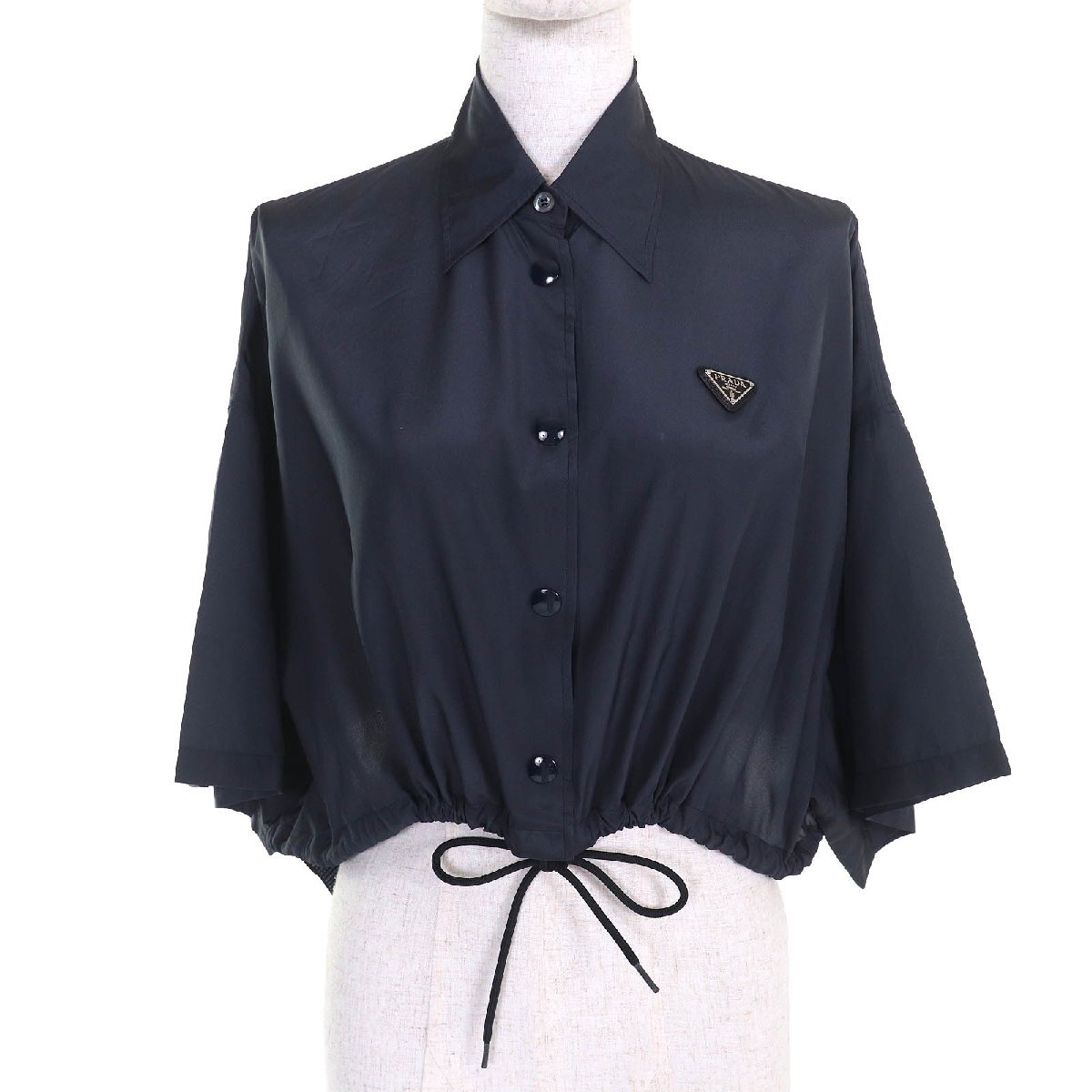 - 美品△PRADA プラダ 2021年製 P454F シルク100% トライアングルロゴプレート ドローコード付き 半袖シャツ ネイビー 38 伊製 正規品