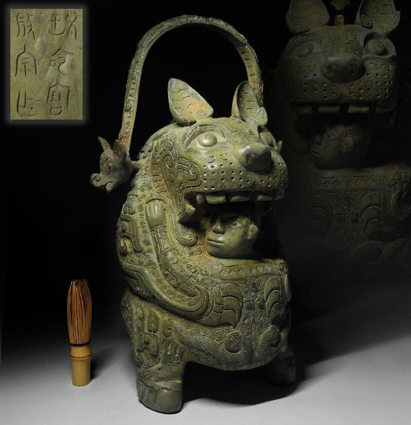 - 緑屋i■ 中国古玩 古銅 青銅器 虎食人ユウ 虎ユウ 提梁 蓋壺 金文銘文 唐物 時代物 i9/0925-8/22-4#100