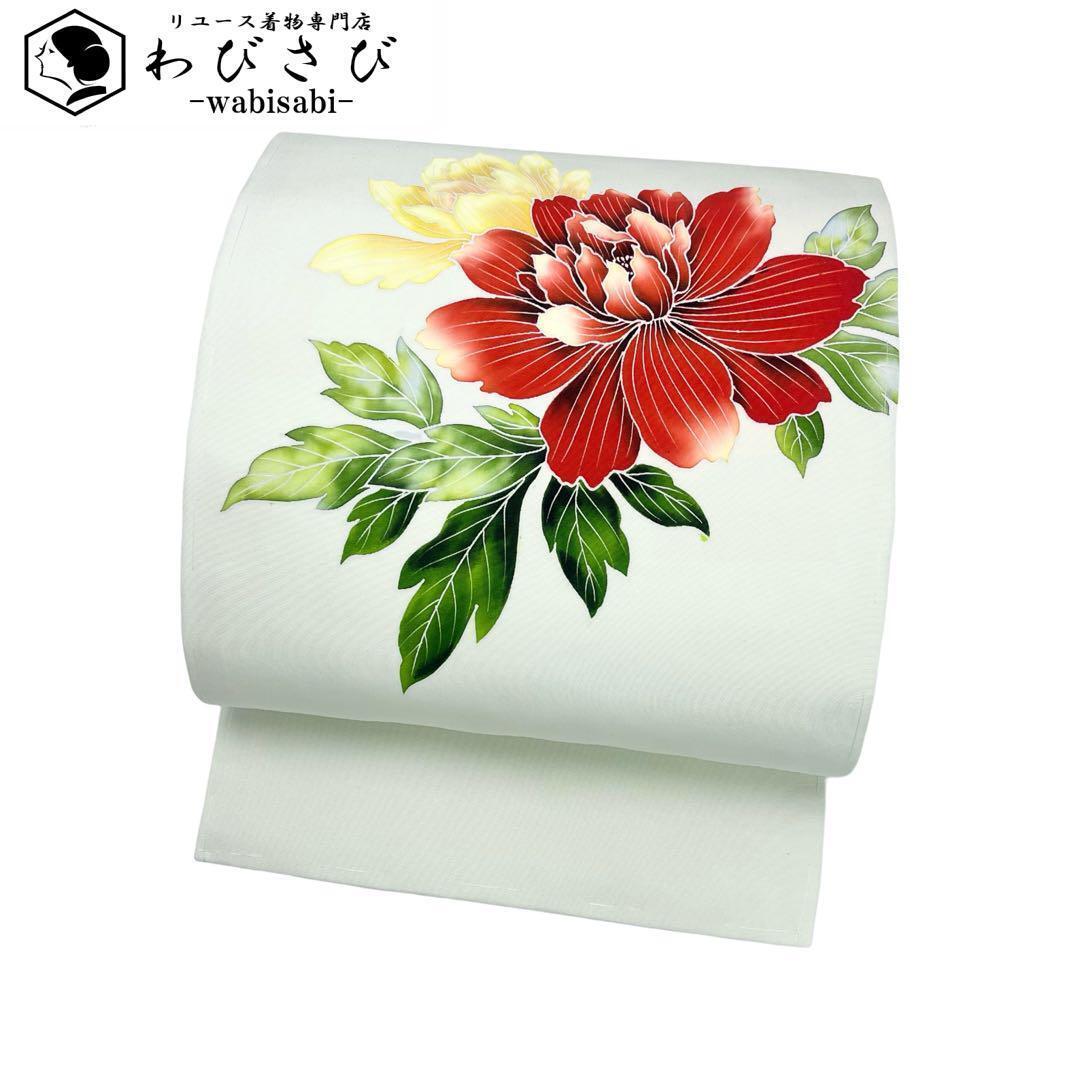 - 名古屋帯 塩瀬 鮮やかな牡丹の花 硫黄色 O-3874 着物 きもの kimono 和服 和装 中古 リサイクル着物 【送料無料】