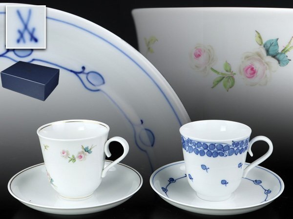 > 魁◆本物保証 マイセン ホワイトミニローズ・ブルーパニクル コーヒーカップ&ソーサー 2種セット 専用箱付