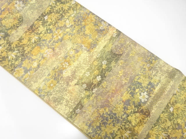 > 美品 引箔 ヱ霞に花唐草模様織り出し 袋帯 (IBF2K-003)