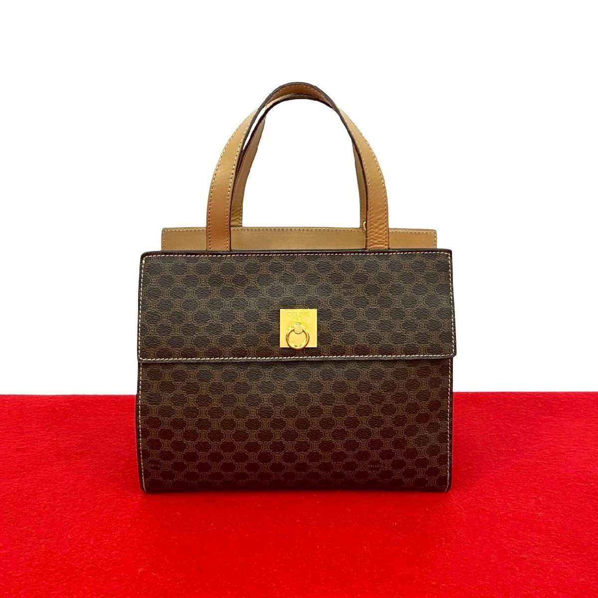 > 極 美品 CELINE セリーヌ マカダム ブラゾン トリオンフ 柄 ロゴ リング金具 レザー ハンドバッグ ミニ トートバッグ ブラウン 05285