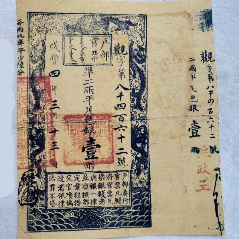 - 中国紙幣 古代貨幣 清 戸部官票 咸豊四年制銀壱両 戸部官票 見本