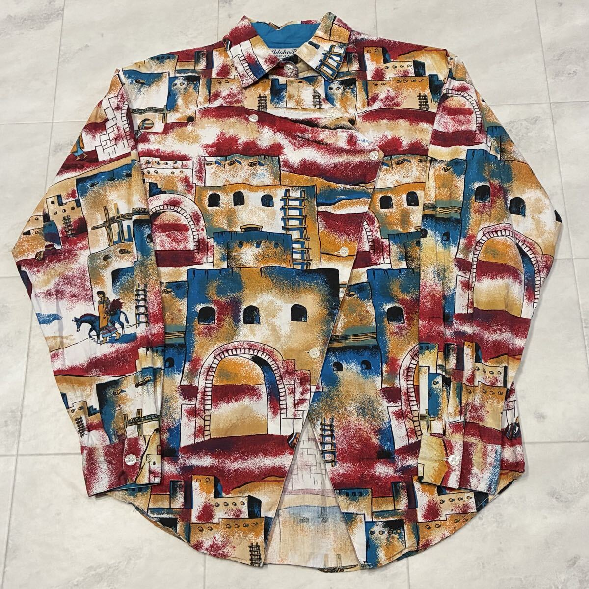 - 90s Adobe Rose 1992 総柄 柄シャツ 変形 レトロ アート ビンテージ 長袖シャツ NEPAL製