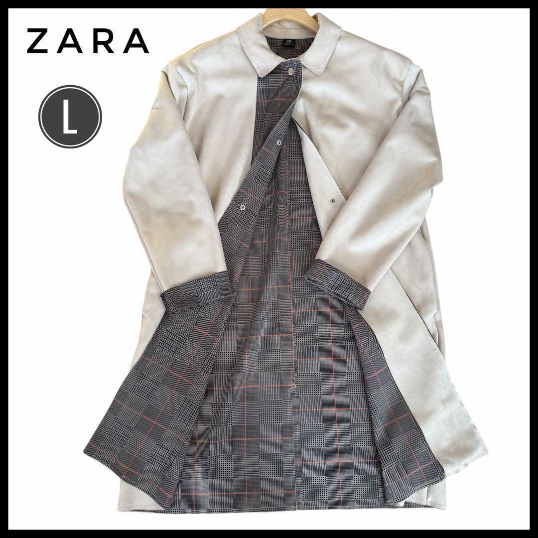 > アウター コート ZARA ザラ ベージュ ロングコート Lサイズ チェック 秋 ロング丈 女性 レディース 冬 防寒