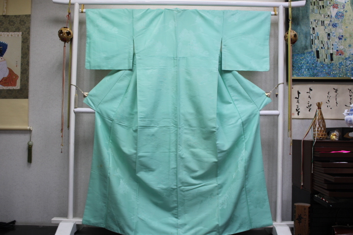 > きもの今昔9001 色無地きもの 広衿袷手縫い仕立 シルクウール生地緑帯びた水色無地 身丈165cm