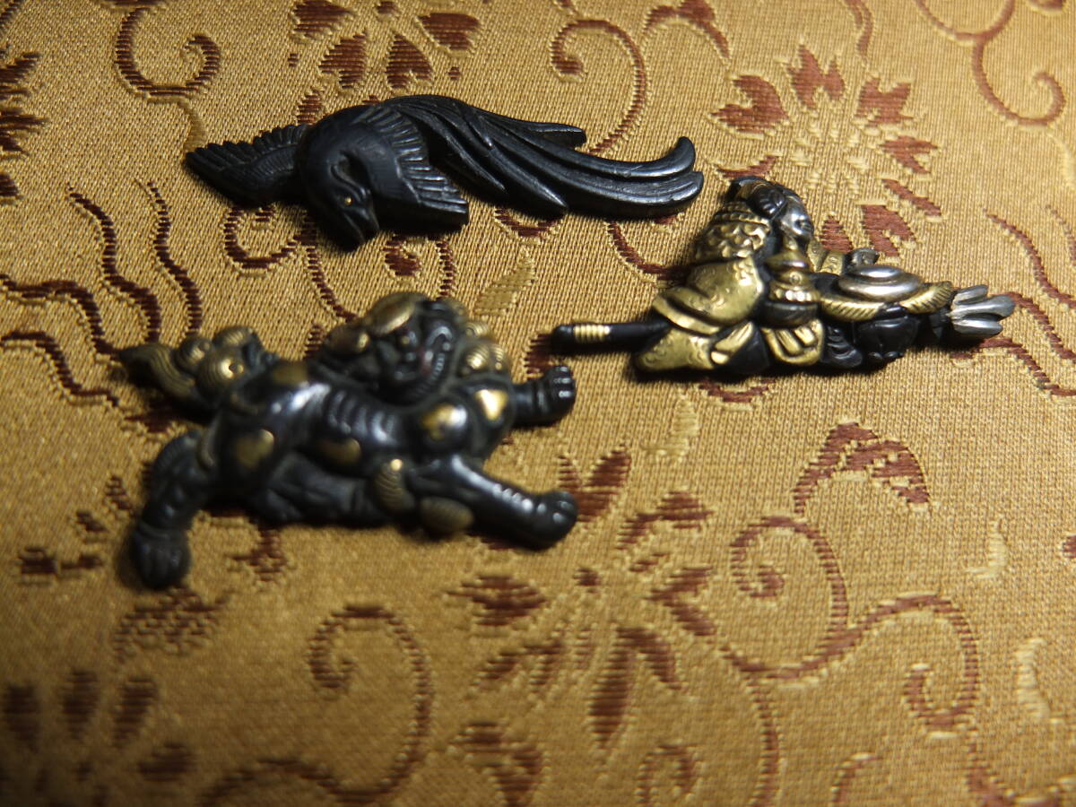 - 【古玩】赤銅古目貫3点一括 獅子・武将・鳳凰 傷み無く3点共に健全