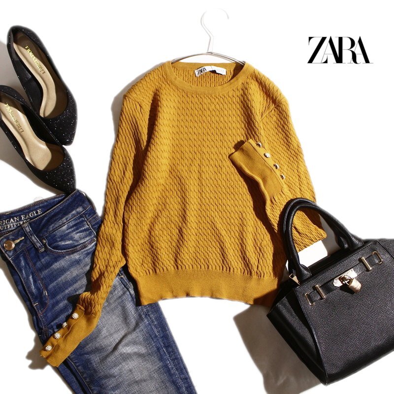 - 美品 ZARA ザラ 渋い きれい色 飾り編み アクセサリーボタン 丸首 ストレッチ ニットセーター ニットカットソー イエロー 黄色 S