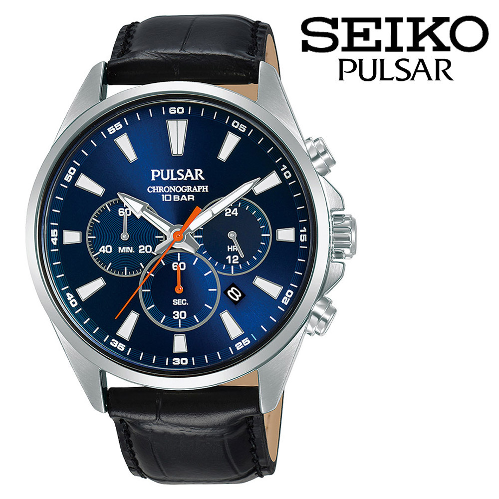 > SEIKO PULSAR Chronograph Blue Black Leather Watch セイコー パルサー クロノグラフ レザーベルト ブラック ブルー 100m防水 本革 腕時計