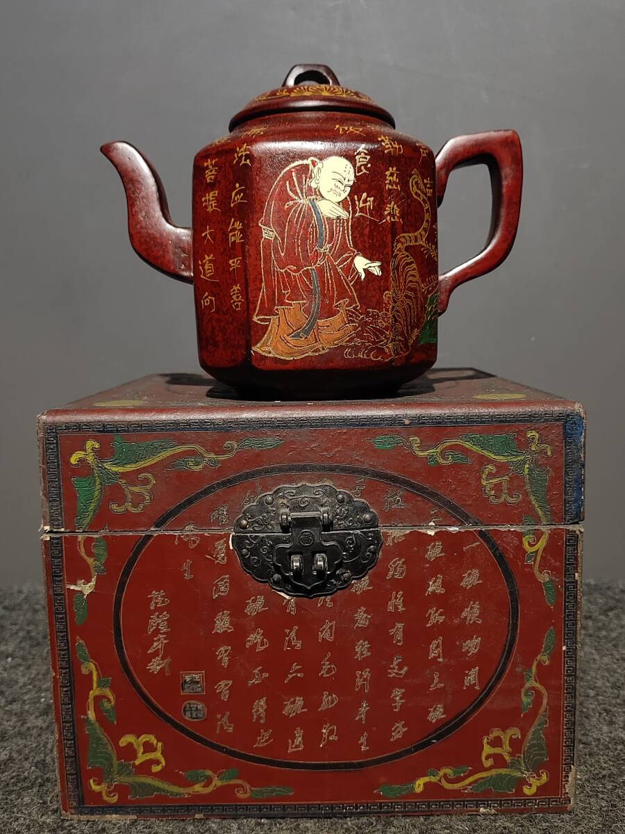- ◆珍蔵◆中国古美術 清時代 羅漢図 朱泥急須 紫砂壷 煎茶道具 漆器箱 細密細工造 置物 擺件 古賞物 骨董品 時代物 AT17