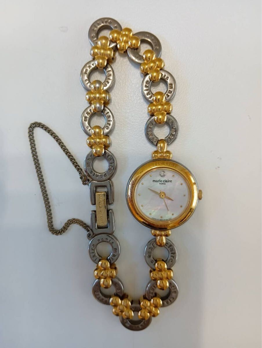 - 【中古品】マリ・クレール marie claire レディース ブレスレット型腕時計 シェル文字盤 1Pダイヤ くお クォーツ ゴールドカラー 現状品
