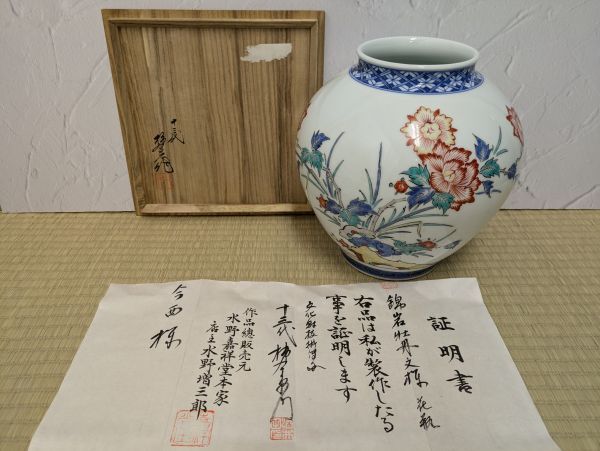- Mn3481 十三代 酒井田柿右衛門 本人作 染錦岩牡丹文様花瓶 肉筆証明書付 共箱 花器