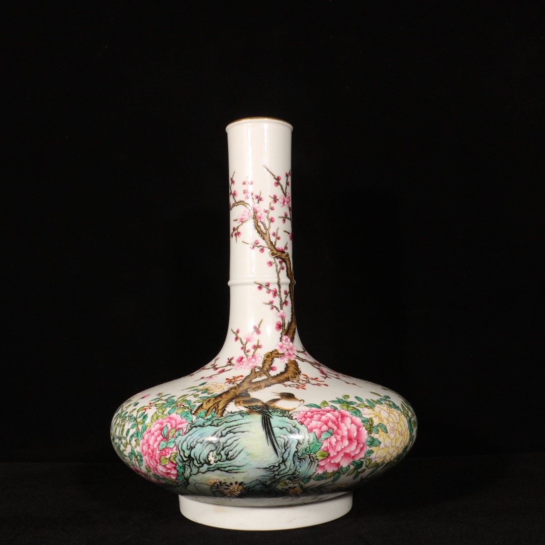 > 清時代 雍正 粉彩 描金 花鳥文扁肚瓶 唐物 箱付き 陶磁器 中国美術 古美術 置物 骨董品 高さ29cm 直径22cm RG1089