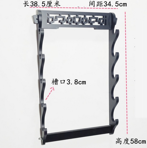 - 新作 刀掛け 5本用 木製黒塗り 彫り台 飾り棚 日本刀 模造刀 居合刀 竹刀 壁掛け用