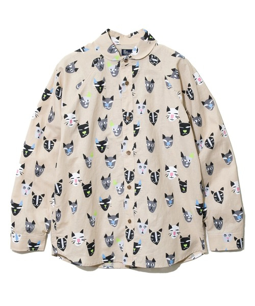 - ●美品 go slow caravan ゴースローキャラバン 総柄シャツ 猫プリント リネン混 BEG サイズ3