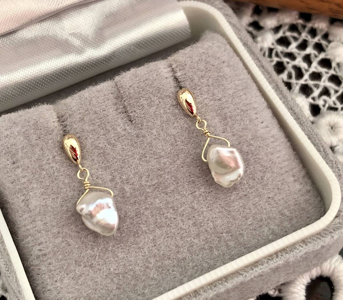- 美品現品10金イエローゴールドブラピアスK10YG★丸井購入 6月誕生石 バロックパール ケシパール ホワイト系カラー テリ良い★K10刻印あり