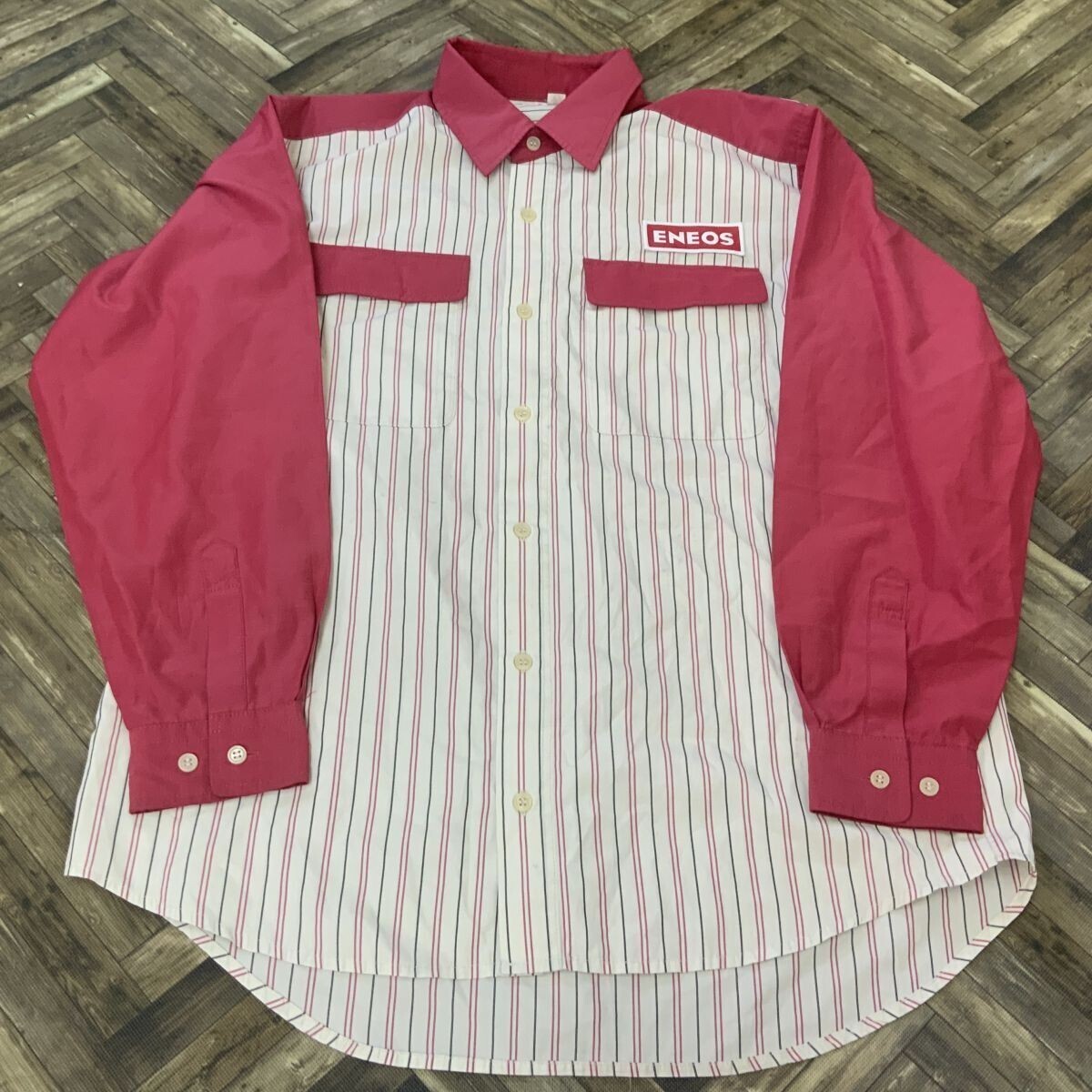 - HY856 実物 エネオス ワークシャツ 作業着 レッド ホワイト L 汚れあり