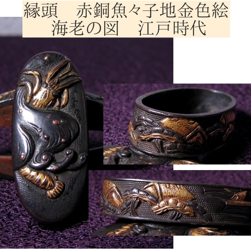 - 時代武具 縁頭 赤銅魚々子地金色絵 海老の図 桐箱付 江戸時代/25e081
