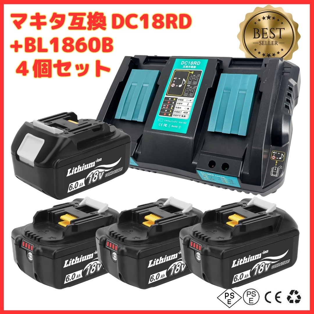 - (A) マキタ 互換 DC18RD + BL1860B (1台と4個) 2口充電器+バッテリー(4個)セット 残量表示付き