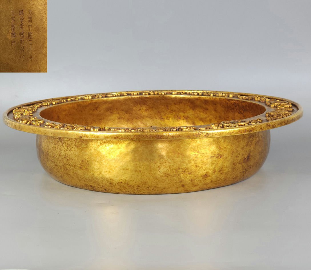 - ◆羽彰・古美術◆Y728清時代 銅塗金双鳳盆 細密細工★古置物★古賞物★古擺件★蒐集家放出★唐物
