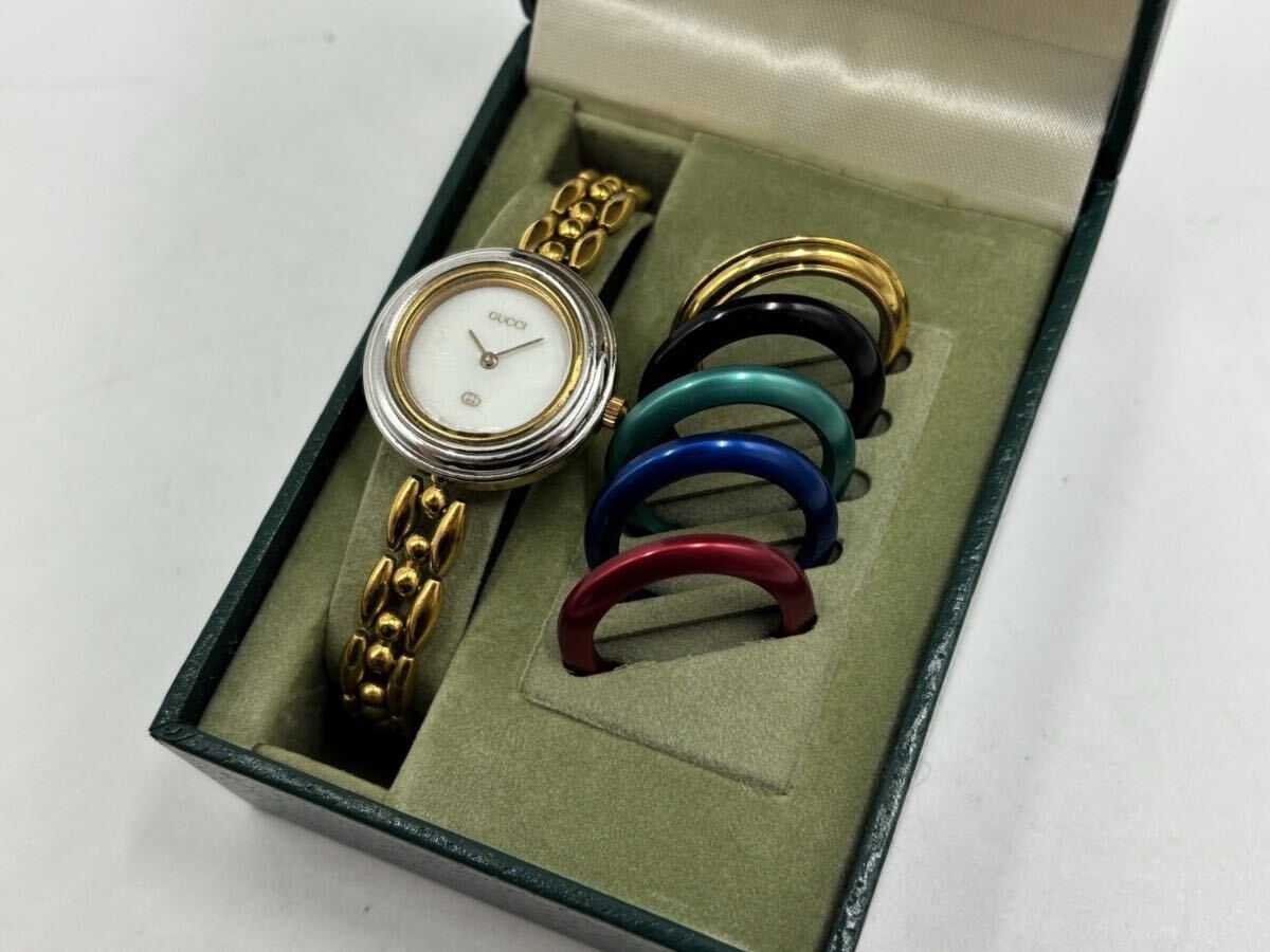 > H39032002525 GUCCI グッチ レディース腕時計 11/12 白文字盤 クオーツバングルウォッチ 2針 不動 チェンジベゼル付き 箱有 現状品 中古