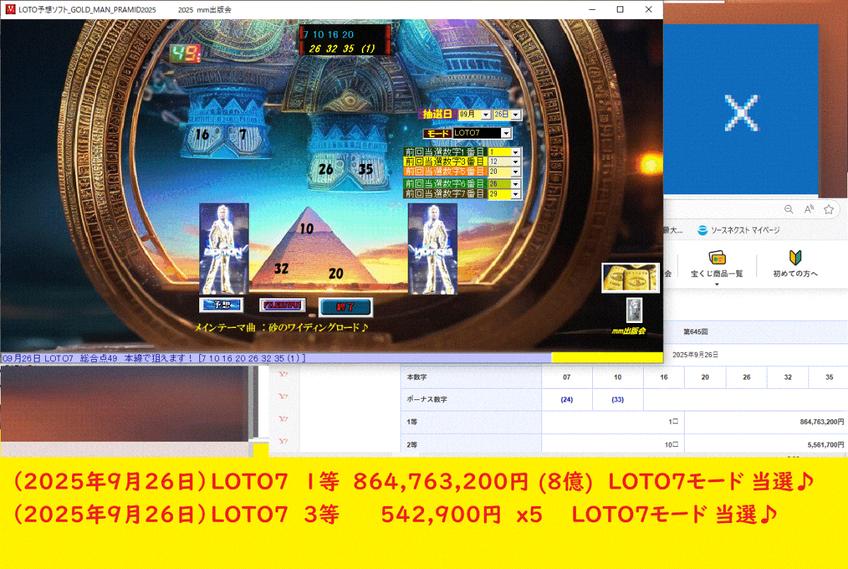 新作 [LOTO予想ソフト_GOLD_MAN_PRAMID2025] ロト予想ソフト をご案内申し上げます。(2025年9月26日)LOTO7 1等 864,763,200円 (8億) LOTO7モード 当選♪ (2025年9月26日)LOTO7 3等 542,900円 x5 LOTO7モード 当選♪ (2025年9月26日)LOTO7 5等 1,600円 x3 ゴールドマンモード 当選♪ 高額当選仕様で設計されている予想ソフトですので、勝負どころでは、バッチリ行ってください。このソフトは、各ロトとも予想点数が、本線1点 ボーナス数字1点の予想です。●本ソフトの特徴としまして、GOLD_MANモードがあります。GOLD_MANモードは、全ロト共通のミックス予想です。(2025年9月26日)LOTO7 1等 864,763,200円 (8億) LOTO7モード 当選♪ (2025年9月26日)LOTO7 3等 542,900円 x5 LOTO7モード 当選♪ (2025年9月26日)LOTO7 5等 1,600円 x3 ゴールドマンモード 当選♪ [LOTO予想ソフト_GOLD_MAN_PRAMID2025 ]09月26日 LOTO7 総合点49 本線で狙えます! [7 10 16 20 26 32 35 (1) ][LOTO予想ソフト_GOLD_MAN_PRAMID2025 ]09月26日 ゴールドマン 総合点76 本線で狙えます! [1 10 26 4 32 (35) (17) ]このツールは、診断チェック機能を装備した、予想ソフトです。 1.買いたいロト券が、本当に信頼できるのか、ガチで勝負しても、大丈夫なのか? 2.買い目を数点に絞りたいが、有望な勝負できる数字を、知っておきたい。 3.ロト6と7とミニで1、2点で勝負に適した買い目を知りたい。 要は、このソフト 一点一点の買い目の診断と、勝負になる絞った予想の買い目も出してくれます。 診断した買い目の総合の評価点数や、どんな勝負度合いが良いかの指示も出ます。[LOTO予想ソフト_GOLD_MAN_PRAMID2025の具体的仕様な説明]・このソフトは、パソコンWindows版の全てに対応しています。Xp Vista 7 8 8.1 10 11 動作確認済み ・買い目は、全てのロト基本 本線1点 ボーナス数字1点 予想 です。 GOLD_MANモードは、全ロト共通のミックス予想です。・熱い予告の時に、333、777、★V★ランプも点灯します。液晶がGOLD_MANに変われば、超激アツ!!・買い目の一つ一つについて診断が出来る予想ツールです。・診断だけでなく、LOTOの勝負の度合いも指南してくれます。・予想ソフトは、過去の当選数字が閲覧、参照などができれば、だれでも簡単に予想できます。・画面を見ての通り、入力箇所も6箇所程度で、マウスによる選択形式です。シンプルで簡単です。今だけ、特別にご奉仕価格にて、ご提供致します。 是非お薦めです♪[LOTO予想ソフト_GOLD_MAN_PRAMID2025] ロト予想ソフト価格598,000円→価格5000円