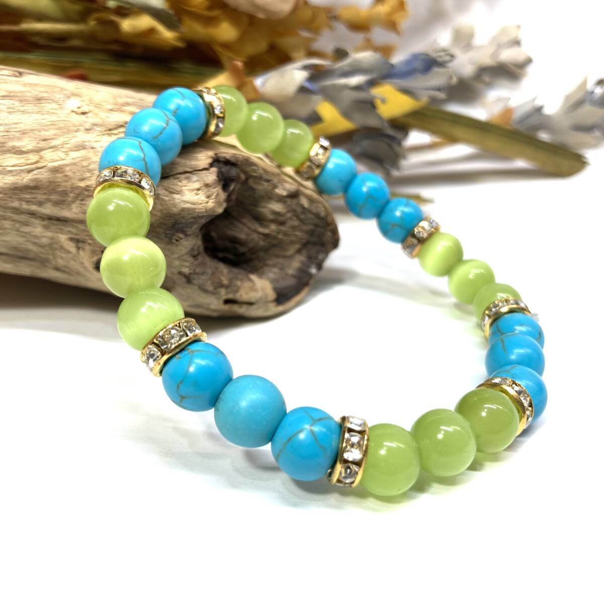 > ターコイズ&キャッツアイ(ライムグリーン)パワーストーン ブレスレット(ゴールド)メンズ レディース 男性 女性 開運 数珠 お守り